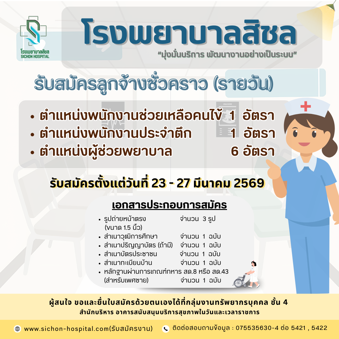 โรงพยาบาลสิชล ประกาศรับสมัครบุคคลเพื่อคัดเลือกเป็นลูกจ้างชั่วคราว (รายวัน)