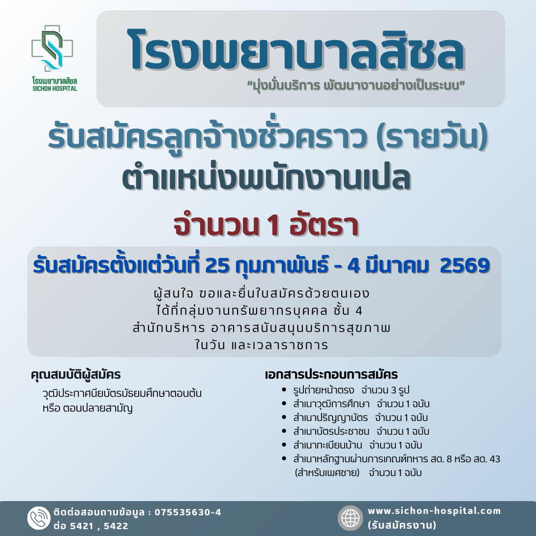 โรงพยาบาลสิชล ประกาศรับสมัครบุคคลเพื่อคัดเลือกเป็นลูกจ้างชั่วคราว (รายวัน)